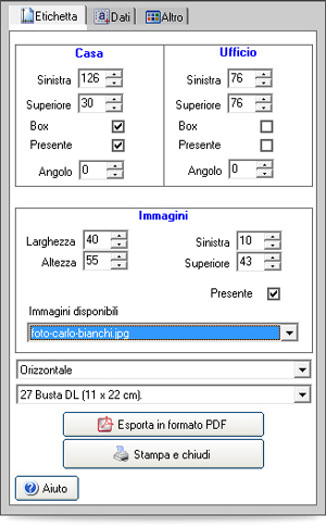 Nella pagina “Dati” in Anteprima di stampa si ha la facoltà di scegliere quali informazioni debbano comparire nell’etichetta Casa e/o Ufficio ed il tipo di carattere da utilizzare.
